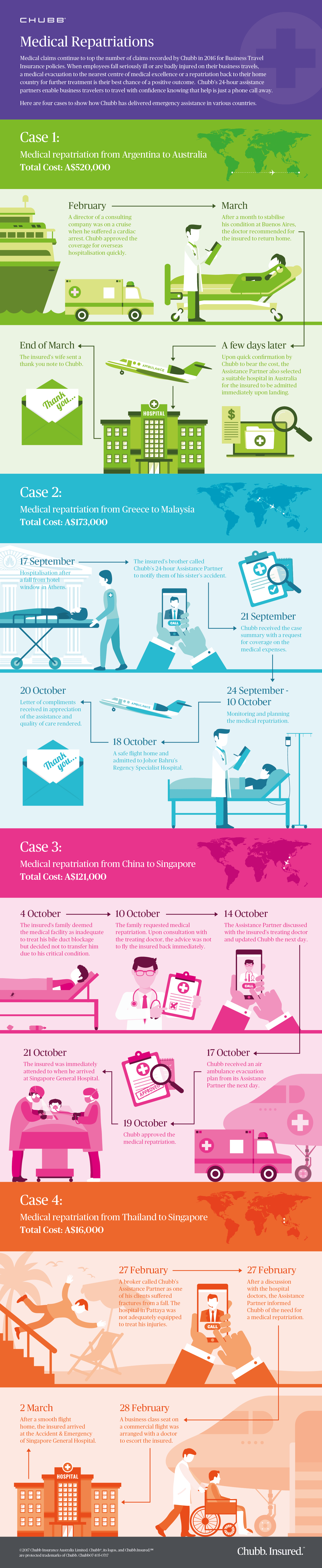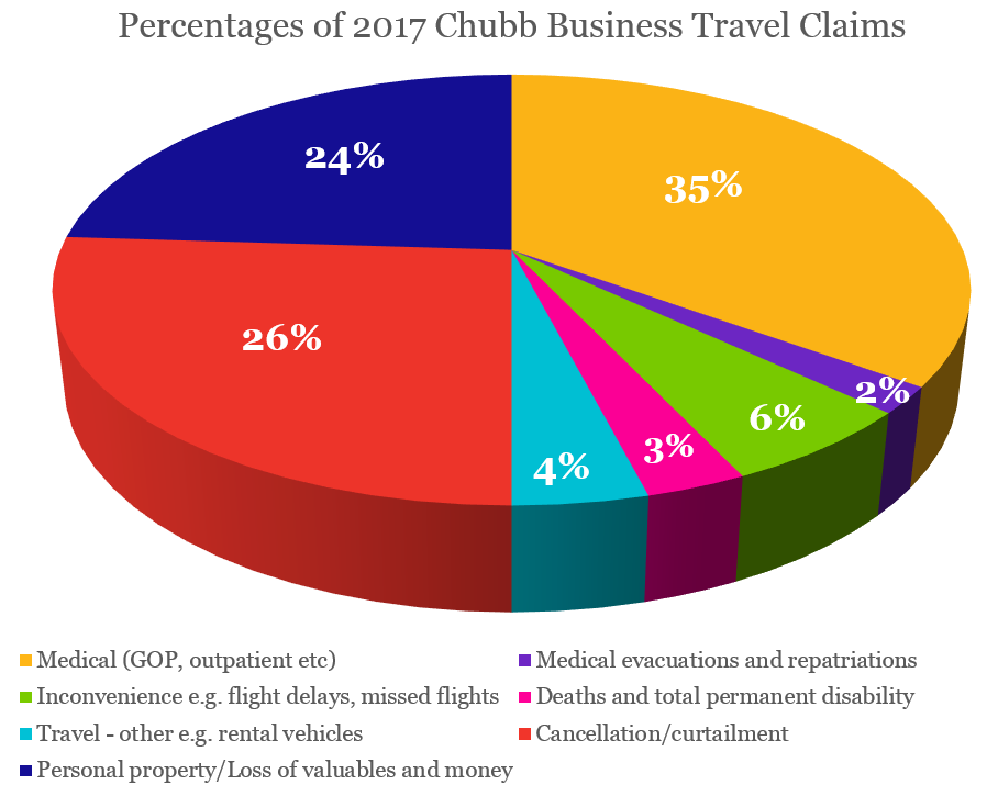 Medical claims continue to top the number of claims recorded by Chubb in 2017 for Business Travel Insurance policies. While medical evacuations and repatriations form only a small percentage in comparison, their usually high cost may be covered by a group business travel insurance policy.