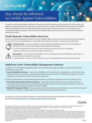 Informed by our access to extensive cyber loss data and enabled by our Cyber Threat Intelligence team, policyholders have direct access to a range of services that can help identify, manage and mitigate cyber exposure before an incident happens. These services now include our Cyber Vulnerability Outreach Program. Click here for more info on Chubb's Cyber Services.