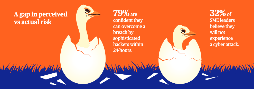The overconfidence in being able to manage cyber risks still exists among SMEs in Australia. 79% of respondents are confident they can overcome a breach by sophisticated hackers within 24 hours, while 32% believe that they will not experience a cyber attack.