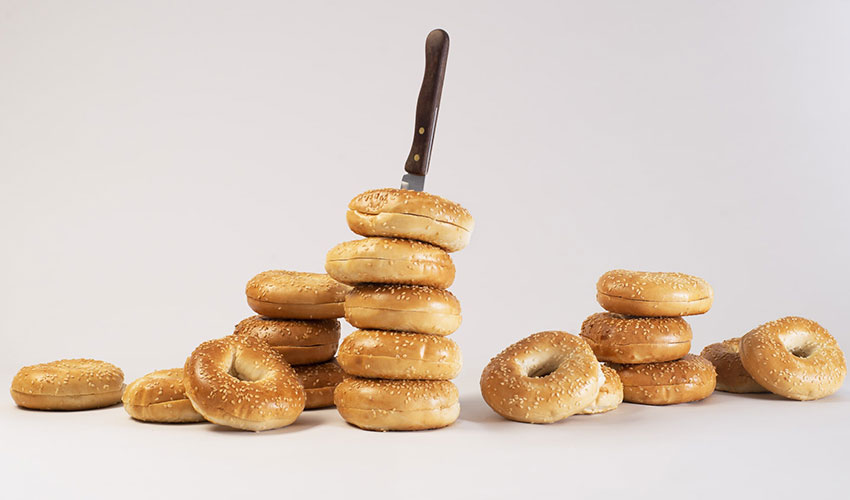 Le tranchage de bagels s’est classé au cinquième rang des activités de cuisine les plus dangereuses en 20112. Pour éviter de vous couper (et pouvoir déguster votre bagel au lieu d’aller aux urgences), déposez le bagel sur une surface de travail et appuyez le plat de votre main sur le dessus. De l’autre main, coupez le bagel à l’horizontale avec un couteau à pain dentelé, parallèlement à la surface de travail.