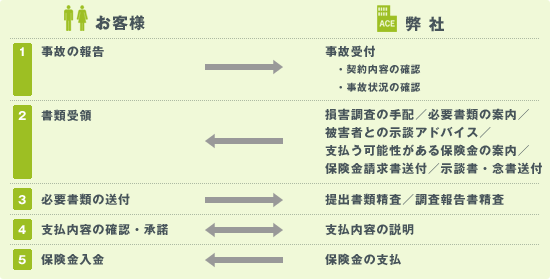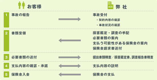 ご契約の什器備品が次の事故によって損害を受けた場合の事故受付から保険金のお支払いまでの流れをご案内しています。
