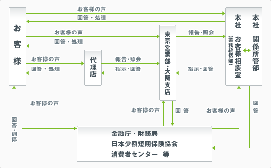 「お客様の声」の対応責任窓口は業務統括部のお客様相談室です。 支店、損害サービス部門や代理店でお受けした「お客様の声」は、お客様相談室に集約され、毎月社内で開催する経営会議に報告し、検討されます。改善等の必要がある場合には、関係部署への指示を行っております。