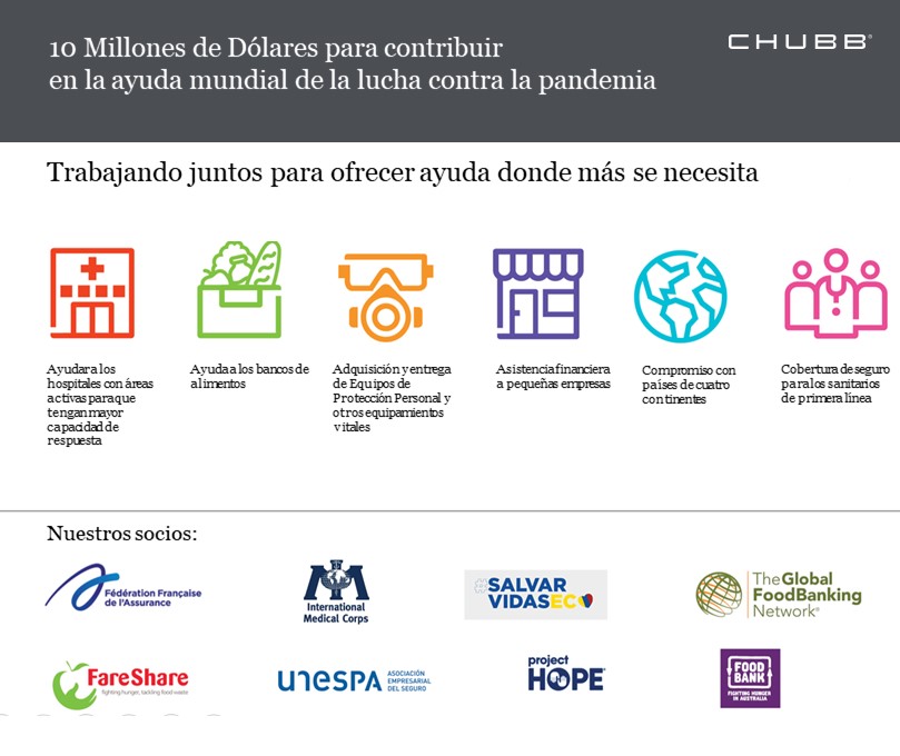 - Apoyo a los bancos de alimentos de primera línea mediante la Red Mundial de Bancos de Alimentos (GFN): con más de un tercio de los trabajadores del mundo desempleados debido a la pandemia, los bancos de alimentos de todo el mundo están viendo un aumento abrumador de la demanda de ayuda alimentaria. La contribución de 1,5 millones de dólares de Chubb está ayudando a la GFN a prestar la ayuda urgente que se necesita en los bancos de alimentos de todo el mundo, tras una evaluación de las zonas con mayores necesidades. El apoyo de Chubb comprende donaciones directas al Banco de Alimentos de Australia; ‘Fareshare’ en el Reino Unido; donaciones directas a los bancos de alimentos en Europa; y apoyo a otros programas.