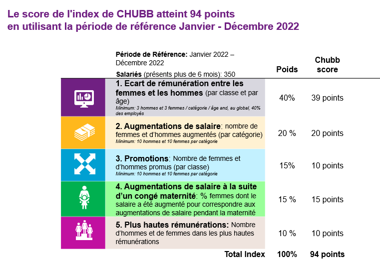 Chubb a à cœur de faire progresser l’égalité entre les femmes et les hommes au sein de l’entreprise. Nous avons conclu avec nos partenaires sociaux un nouvel accord sur l’égalité professionnelle femmes-hommes et qualité de vie au travail le 8 août 2023 afin de promouvoir l’accès à l’emploi, la formation, l’égalité des niveaux de rémunération, la conciliation de la vie familiale et professionnelle.