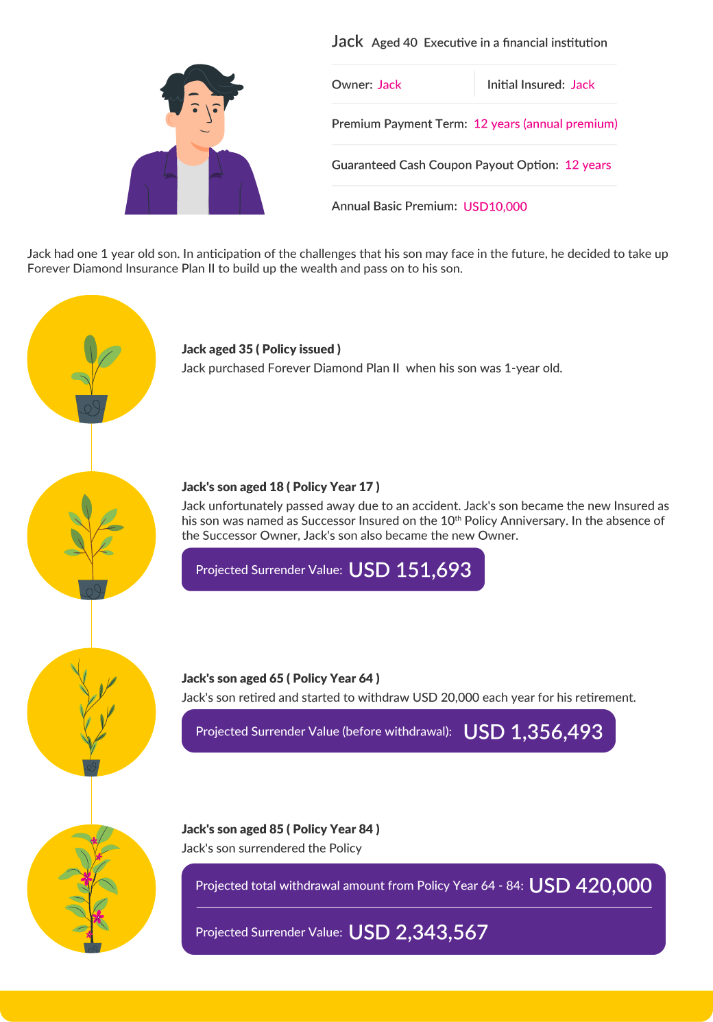 (i) 上述示例纯属虚构及只供说明之用。有关内容与任何真实的人物、组织或事件如有雷同,实属巧合。本产品介绍册示例的性质不应被理解为是对任何过往、现在或将来发生的个案的保险保障的任何评论、确认或伸延。此外,上述示例并不应作为预测任何真实个案结果的依据,因为所有个案均需根据其具体事实评估,并受相关保单的实际细则及条款规限。每个真实个案都是独特的,敬请留意。