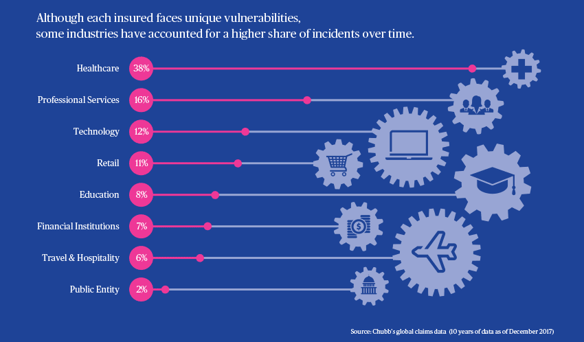 Based on an analysis of Chubb’s prior decade of claims experience, the healthcare industry made up 38% of all claims reported during that period. Further, the trend of incidents impacting the industry has continued into 2018 as the number of Chubb healthcare cyber-related incidents grew 13% over the past two years.