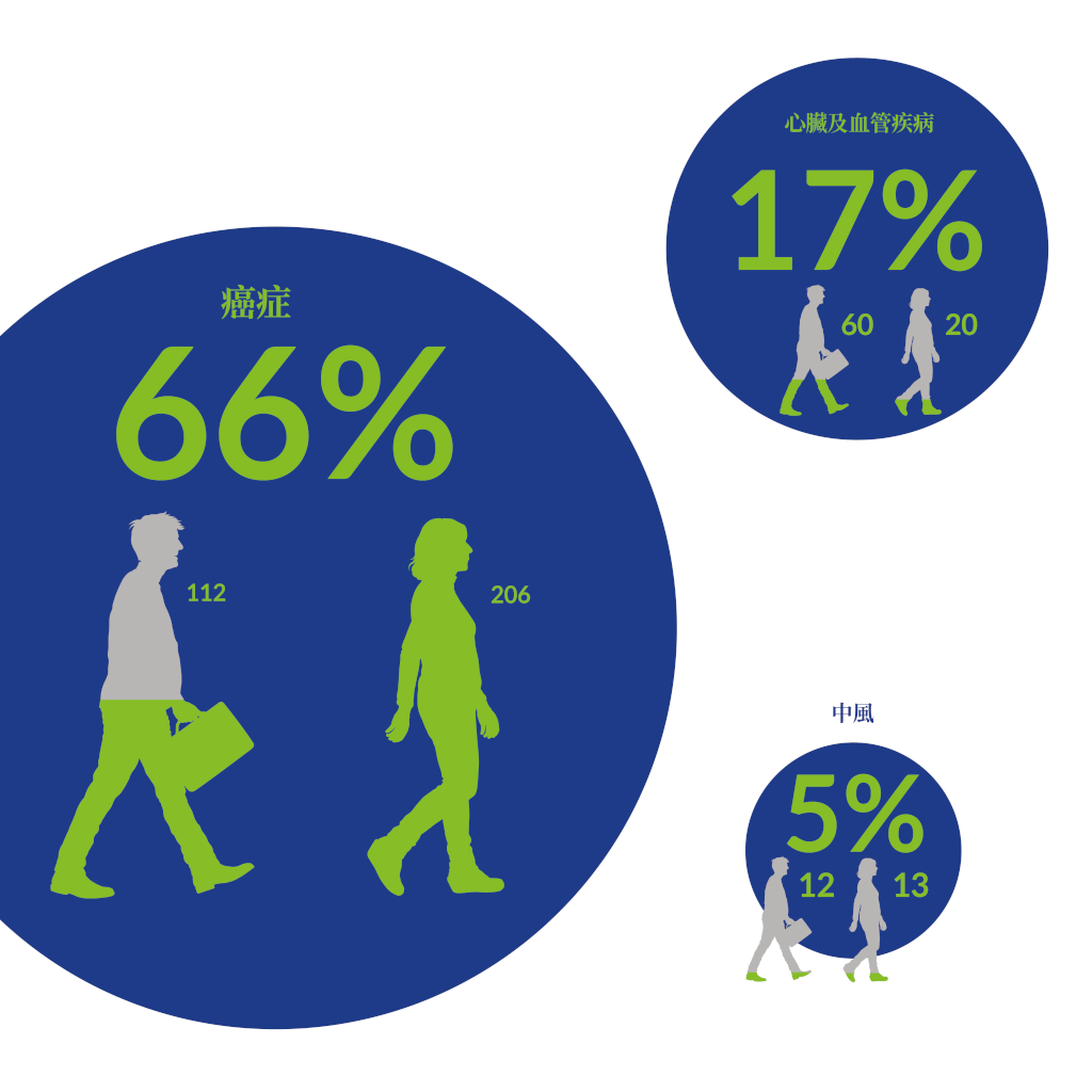2023年,癌症在安達人壽香港危疾索償個案中所佔比例最大,佔該類別所有索償的66%。其次為心血管疾病,佔危疾索償的17%,再次為中風,佔約5%。