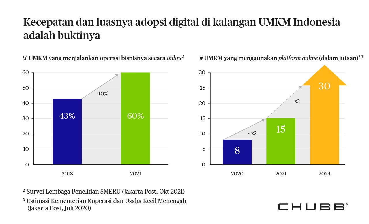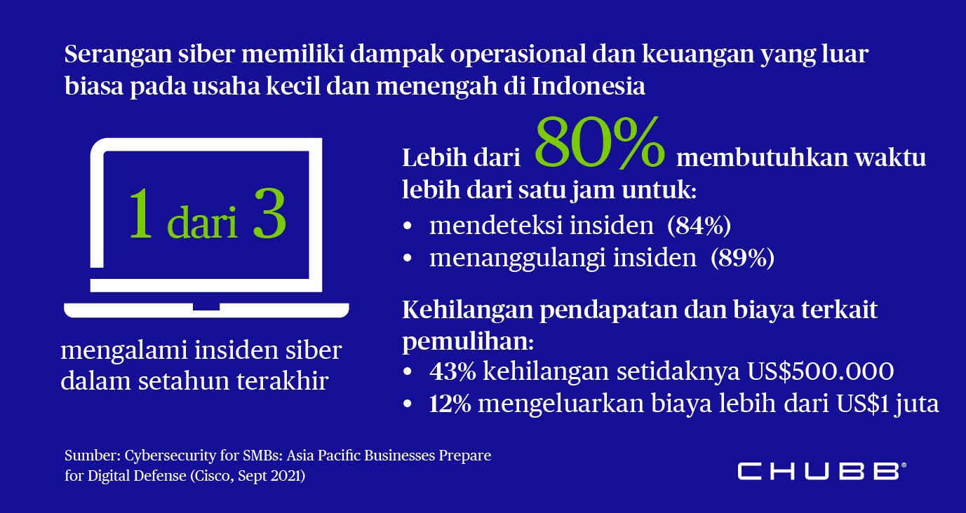 Di Chubb, kami berkomitmen untuk mendukung UMKM Indonesia menjadi lebih tangguh dan mencapai potensi maksimal mereka dalam ekonomi yang beradaptasi dengan COVID-19. Menyadari bahwa segmen yang sangat penting ini memiliki kebutuhan dan persyaratan yang berbeda, kami salah satunya menyediakan SME Protect Plus, solusi yang dapat disesuaikan dan ramah biaya yang dirancang untuk membantu usaha kecil mengelola eksposur siber mereka, selain melindungi mereka dari peristiwa kerugian tradisional seperti kebakaran, banjir, gempa bumi dan pencurian.