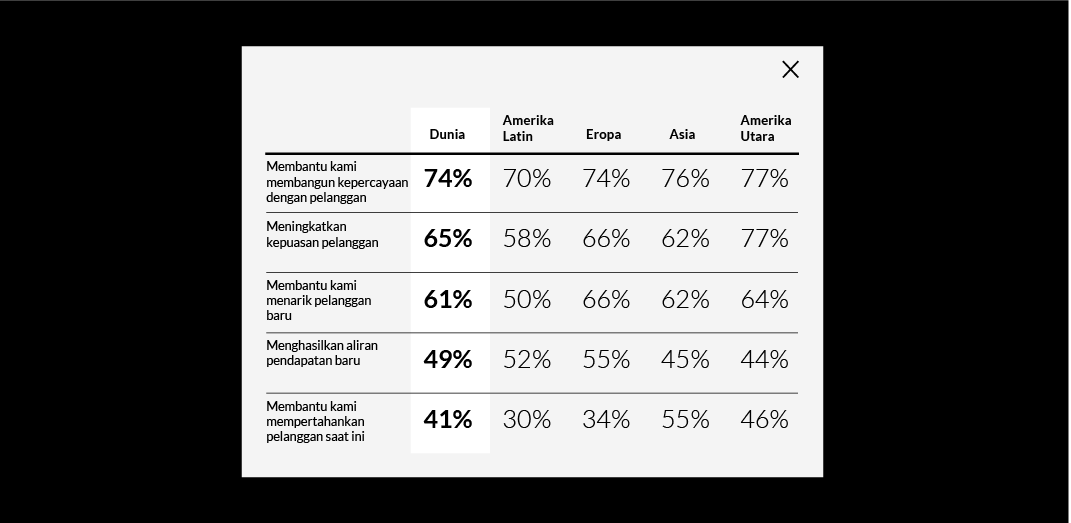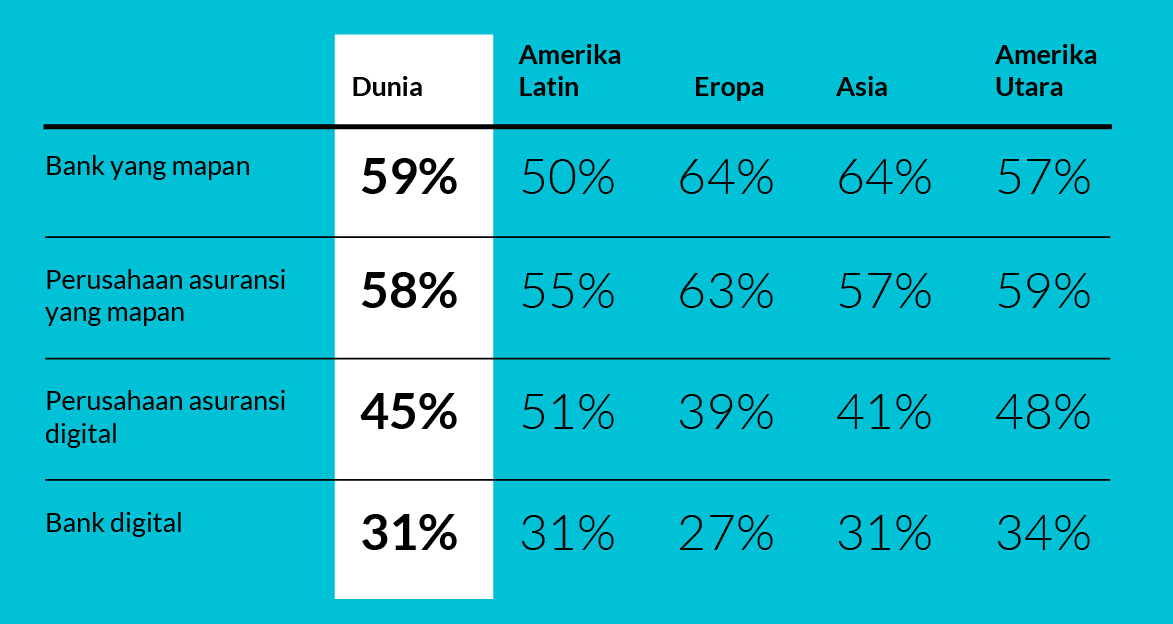 Titik buta: Meskipun konsumen di seluruh dunia memiliki kepercayaan yang jauh lebih tinggi terhadap merek-merek yang sudah mapan dibandingkan dengan merek-merek pendatang baru yang hanya bergerak di bidang digital, hanya 10% organisasi keuangan di seluruh dunia yang mementingkan merek yang dapat dipercaya sebagai mitra asuransi mereka.