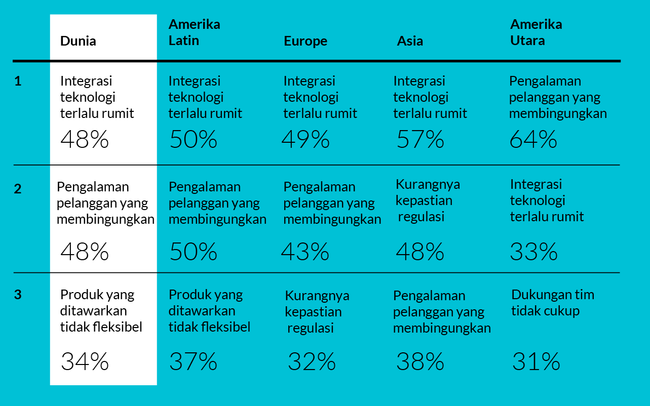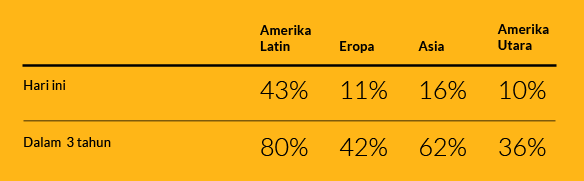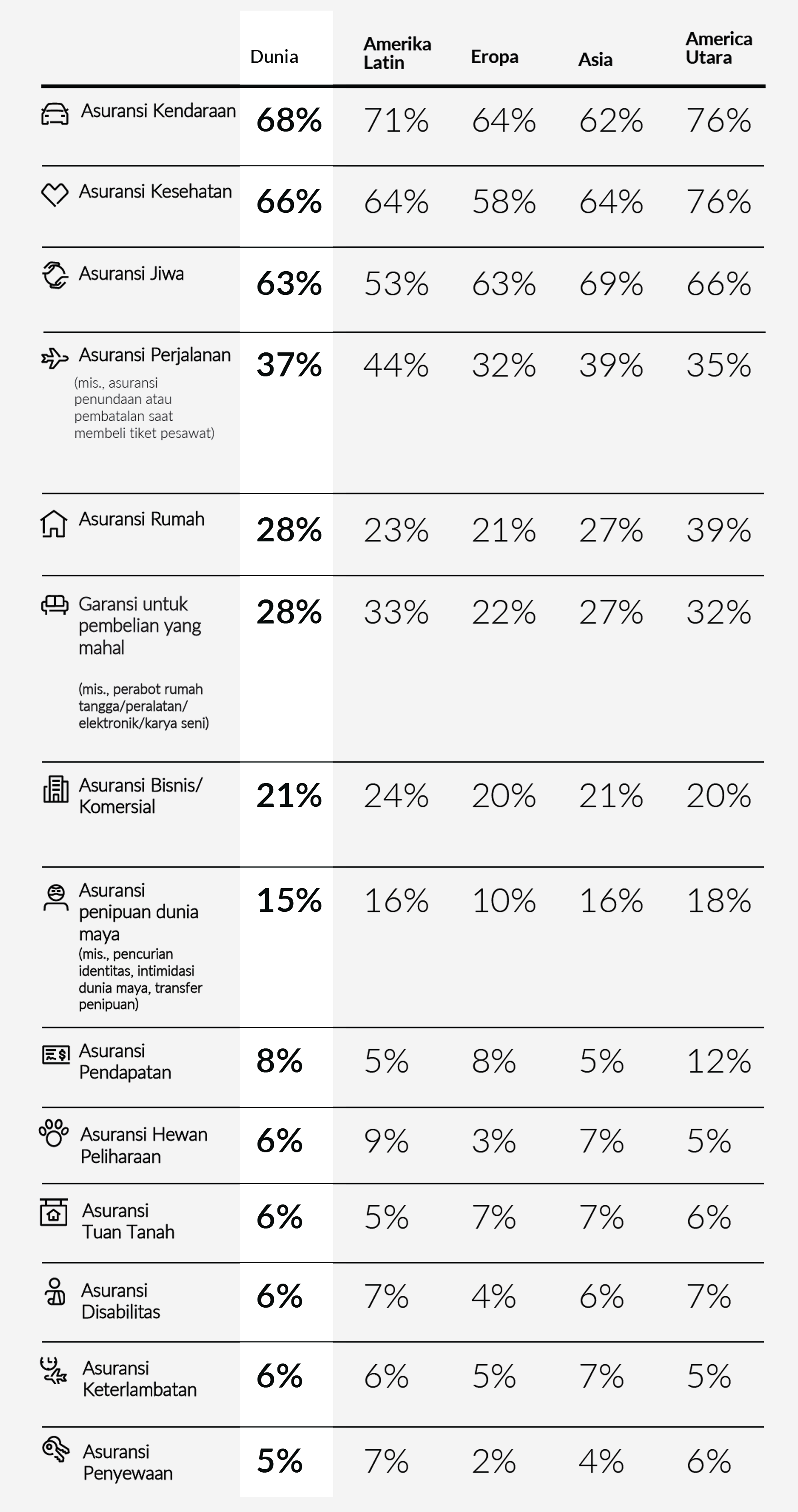 Meskipun kebutuhan dan kematangan pasar keuangan dan asuransi saat ini berbeda-beda di setiap wilayah, pasar global dipengaruhi oleh gaya hidup dan tren sosial yang didorong oleh teknologi di seluruh dunia. Misalnya, pengalaman yang terfragmentasi membutuhkan asuransi dalam potongan-potongan kecil, seperti untuk tujuan tertentu, misalnya melakukan perjalanan rideshare. Perubahan kehidupan kerja, dengan tenaga kerja lepas yang bergantung pada tugas jangka pendek, mengikis keamanan finansial jangka panjang dan menciptakan kebutuhan akan perlindungan pemasukan. Dan kecepatan ini menjadikan keputusan berasuransi menjadi pilihan ya-atau-tidak yang harus diambil dalam sepersekian detik. Dengan demikian, asuransi yang dibeli sebagai bagian dari transaksi lain menjadi lebih menarik, dengan lebih dari separuh konsumen Amerika Latin (55%) membeli asuransi dengan cara ini, lebih banyak dibandingkan di wilayah lain mana pun.