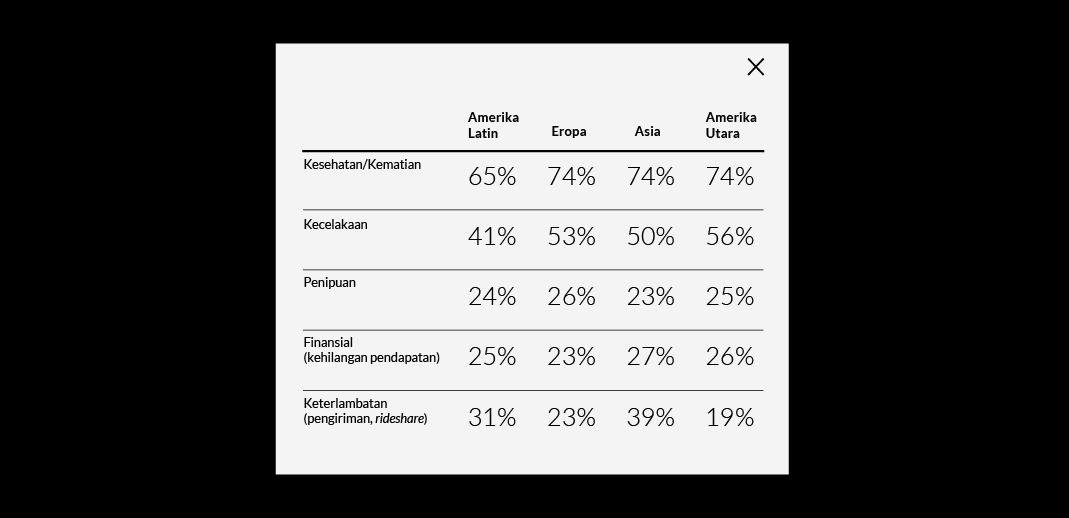 Jenis asuransi yang tidak dimiliki konsumen secara global seringkali terkait dengan risiko zaman modern, yang datang bersamaan dengan meningkatnya semua jenis perjalanan, pergeseran model kerja dari penuh waktu menjadi pekerja lepas atau nomaden, pengenalan model bisnis baru berbasis platform untuk mencari pekerjaan hingga pelanggan untuk berbelanja, adalah beberapa contoh kemajuan dalam cara kita hidup dan bekerja.