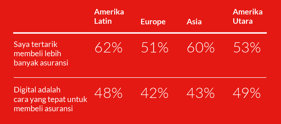 Hampir setengah (46%) percaya bahwa digital adalah cara yang tepat untuk membeli asuransi, dan lebih dari setengah konsumen (56%) percaya bahwa mereka membutuhkan lebih banyak asuransi. Mencerminkan tingkat penetrasi asuransi yang lebih rendah di negara berkembang, minat untuk membeli lebih banyak asuransi lebih tinggi di Amerika Latin dan Asia daripada di Eropa dan Amerika Utara. Namun, perbedaan tingkat minat tersebut tidak sebanding dengan perbedaan kesenjangan asuransi antar wilayah. Hal ini menunjukkan perlunya kesadaran lebih tentang kebutuhan asuransi di negara berkembang. Ini juga menunjukkan bahwa bahkan konsumen di pasar yang sudah matang menyadari bahwa mereka membutuhkan lebih banyak asuransi.