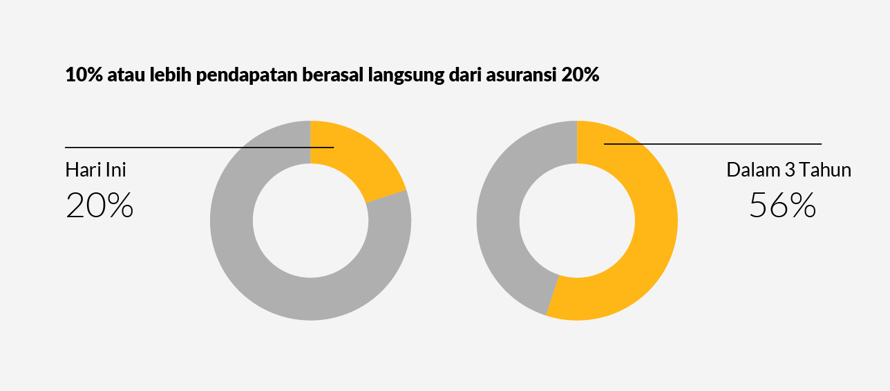 Organisasi keuangan memproyeksikan pertumbuhan signifikan dalam pendapatan yang mereka peroleh dari asuransi. Dalam tiga tahun, lebih dari separuh organisasi keuangan yang disurvei berharap memperoleh pendapatan 10% atau lebih dari asuransi, dibandingkan seperlima yang memperoleh pendapatan sebanyak itu dari asuransi saat ini.