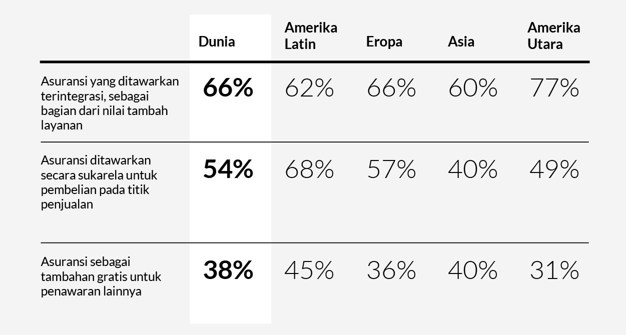 Di seluruh wilayah, menawarkan asuransi sebagai nilai tambah merupakan pilihan utama bagi perusahaan keuangan, terutama di Amerika Utara dan diikuti oleh Eropa. Misalnya, pelancong Prancis yang membawa kartu premium Boursorama Banque, Ultim, dapat merencanakan perjalanan mereka dengan lebih tenang karena kartu tersebut menawarkan asuransi perjalanan yang komprehensif, yang diberikan tanpa biaya tambahan kepada konsumen.
