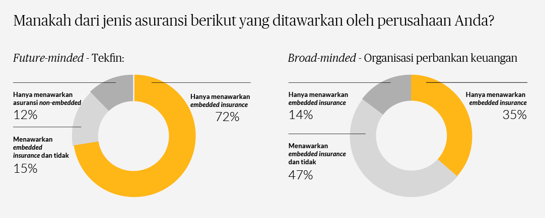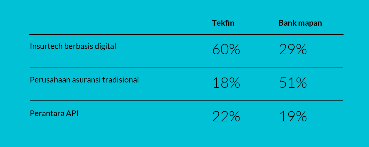 Perbedaan antara perusahaan asuransi mapan dan insurtech menjadi semakin kabur. Sebagian besar penyedia layanan keuangan secara global bermitra dengan perusahaan insurtech untuk menawarkan layanan embedded insurance. Segmen terbesar, 44%, memanfaatkan produk yang ditawarkan melalui insurtech, sementara 35% bermitra dengan perusahaan asuransi tradisional. Di saat yang sama, ada kebingungan mengenai apa sebenarnya yang dimaksud dengan perusahaan “insurtech”.
