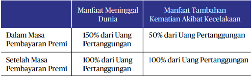 Manfaat Tambahan Kematian Akibat Kecelakaan akan dibayarkan apabilia Tertanggung mengalami suatu Kecelakaan pada Umur tidak melebihi 60 tahun dan dalam kurun waktu 90 hari kalender sejak Kecelakaan tersebut mengakibatkan Tertanggung meninggal dunia, maksimum sebesar Rp2.000.000.000.