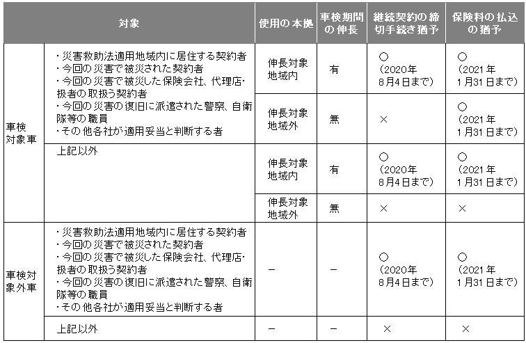 車検伸長対象地域に使用の本拠を有する車両のうち、自動車検査証の有効期間の満了日が2020年7月8日から2020年8月3日までの自動車であり、2020年7月8日から2020年8月4日までに保険期間の終期が到来する保険契約は、同一車両に係る継続契約の手続きを、2020年8月4日を限度として、猶予します。