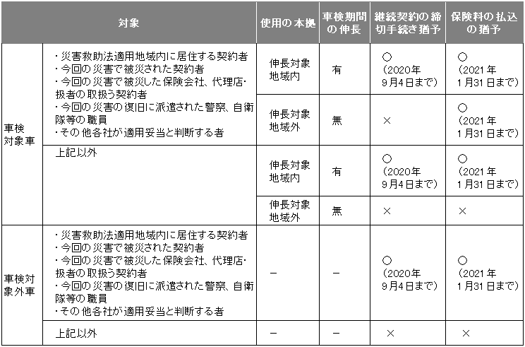 車検伸長対象地域に使用の本拠を有する車両のうち、自動車検査証の有効期間の満了日が2020年7月4日から2020年9月3日までの自動車であり、2020年7月4日から2020年9月4日までに保険期間の終期が到来する保険契約は、同一車両に係る継続契約の手続きを、2020年9月4日を限度として、猶予します。