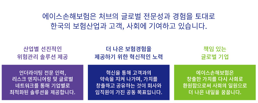 최고의 서비스, 최고의 언더라이팅 전문성 그리고 최고의 실행력으로 최고의 장인 정신을 발휘하는 것이 핵심가치이며, 최고의 장인정신의 모습으로 보험을 개발하고, 보험금을 지급하며, 리스크 관리를 하는데 적용합니다.