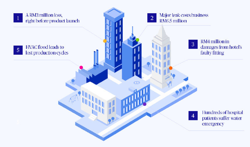 A new technology project was scheduled to be developed, manufactured, and launched when a corroded pipe burst and destroyed key hardware and a critical development lab. Restoration of the lab took almost a year, and alternative lab space had to be outsourced to reduce schedule delays. In total, the business interruption resulted in a loss of RM3 million.