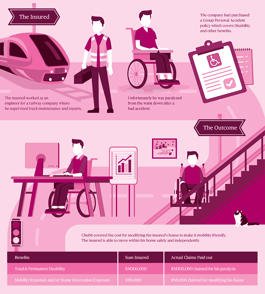 The insured received a lump sum payment when he was paralyzed from the waist as his company’s Group Personal Accident Policy covers Total & Permanent Disability. In addition, he was also able to claim for his home modification.