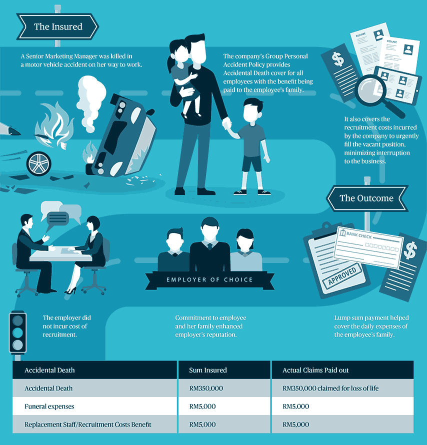 In this unfortunate case, the insured died from a road accident but his family received a lump sum payment from her company’s Group Personal Accident Policy.