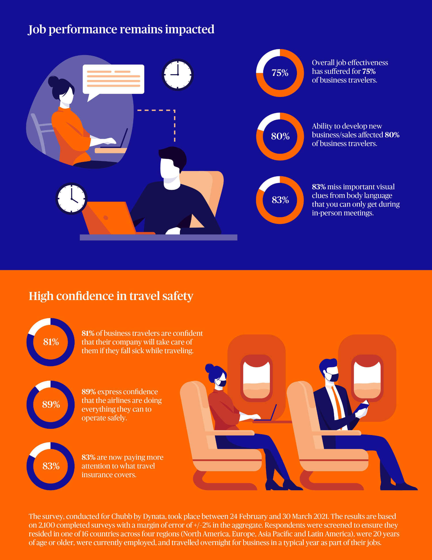 The survey, conducted for Chubb by Dynata, took place between February 24 and March 30, 2021. The results are based on 2,100 completed surveys with a margin of error of +/–2% in the aggregate. Respondents were screened to ensure they resided in one of 16 countries across four regions (North America, Europe, Asia Pacific and Latin America), were 20 years of age or older, were currently employed, and travelled overnight for business in a typical year as part of their jobs.