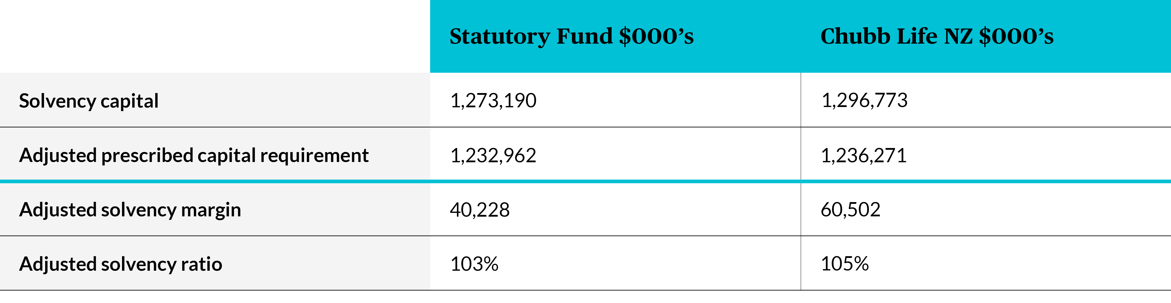The adjusted solvency margin of Chubb Life NZ as at 30 September 2025 is $60.5m, of which $40.2m was the adjusted solvency margin of the Statutory Fund. The table below shows how the adjusted solvency margins are determined:
