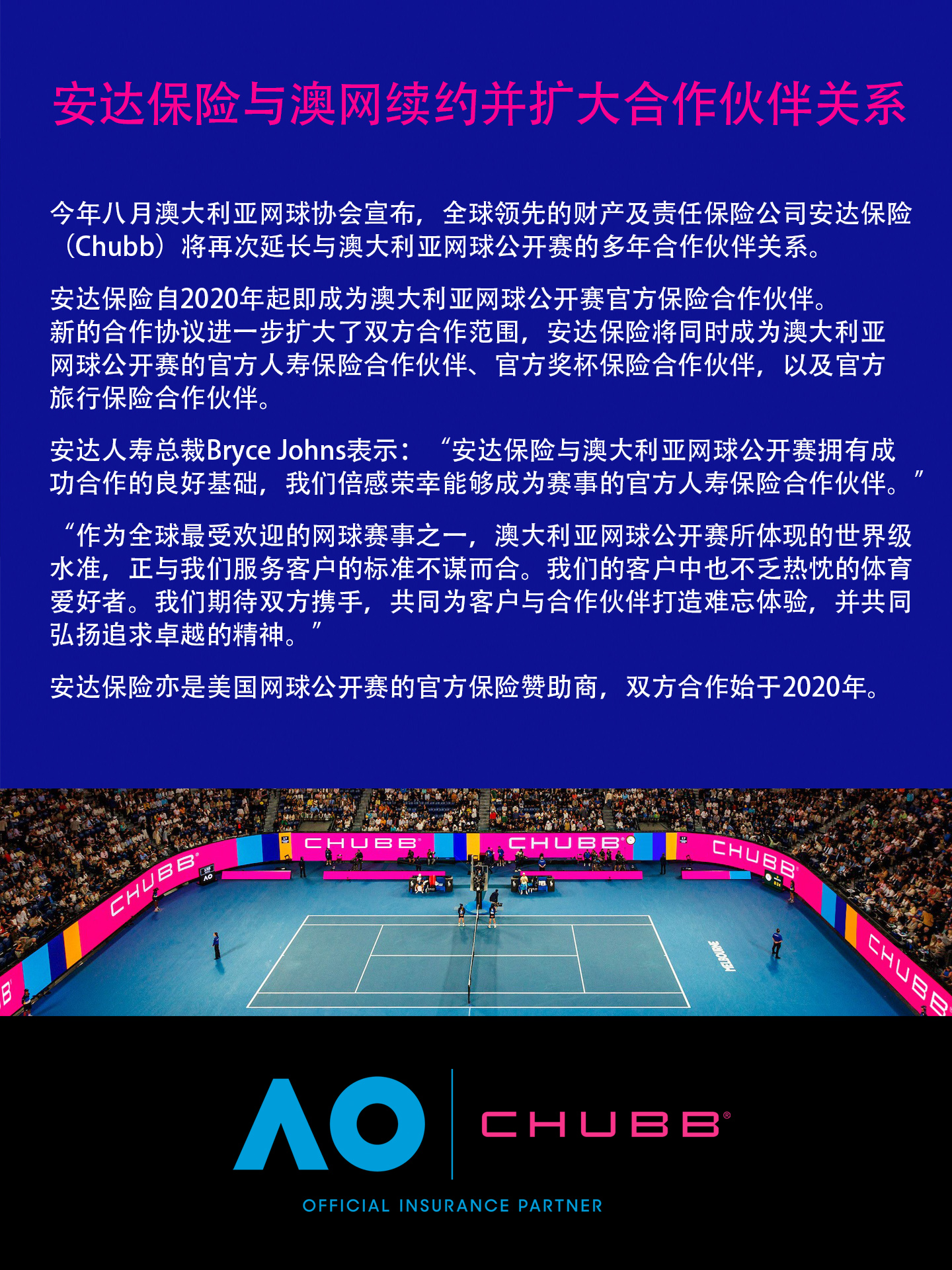 We’ve created a range of marketing assets for the Australian Open in simplified Chinese, specifically designed for WeChat and RedNote. These materials showcase Chubb's partnership of the Australian Open, highlight Chubb's global presence and promote the customer competition we are currently running.