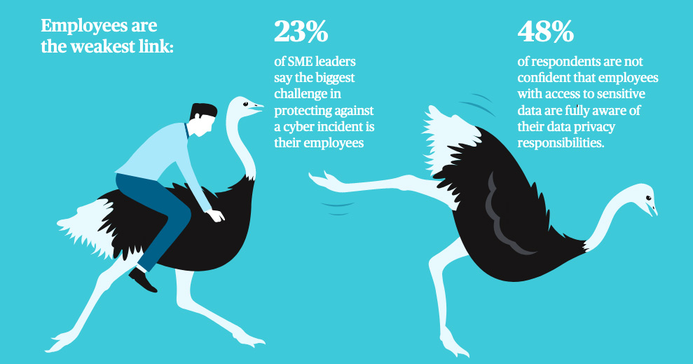 On average, 23% of SME leaders say the biggest challenge in protecting the organisation against a cyber incident is their employees. This is just one of the several data points in the survey suggesting that employees are widely regarded as the weakest link in managing cyber risks. Almost half (48%) of respondents are not confident that employees with access to sensitive data are fully aware of their data privacy responsibilities.