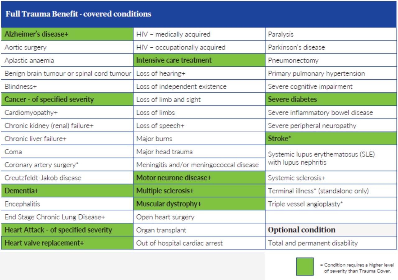 Moderate Trauma Cover differs from Trauma Cover in that some, not all, covered condition definitions require a higher level of severity. These conditions are highlighted in the table below.