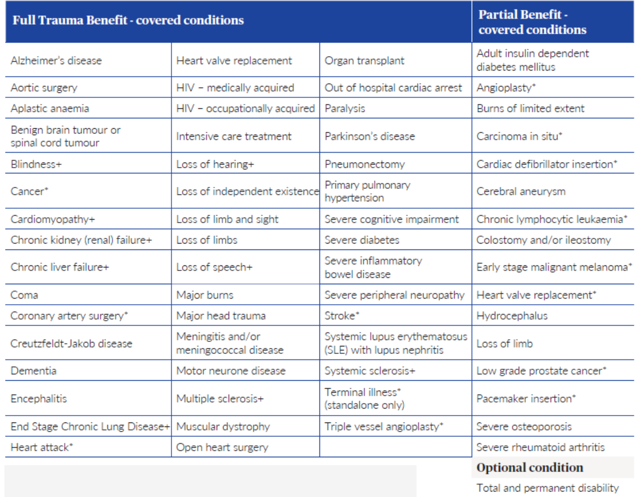 Trauma Cover provides you with comprehensive cover for a number of illnesses and conditions as outlined in the table below. To make a claim, you need to meet the relevant criteria of the condition. The full criteria can be found in the terms and conditions of the Trauma Cover.