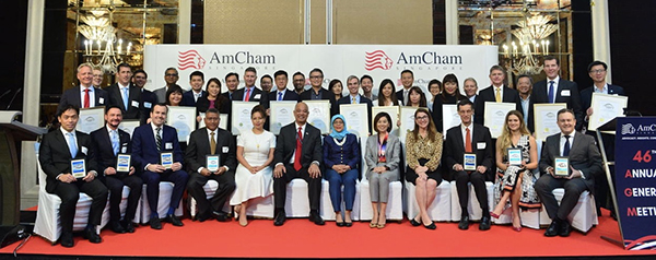 2019 AmCham CARES: Chubb alongside the other AmCham member companies who were recognised and honoured at the event. The awards ceremony was graced by Her Excellency Mdm Halimah Yacob, President of Singapore. (Image Source: AmCham Singapore)