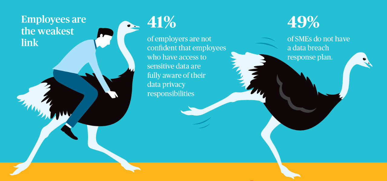 Last year, the most common types of cyber incidents experienced were data loss and business interruption from system malfunction or technical faults, and human error. A weak link identified within the organisation is employees. 54% of cyber incidents were caused by employees, and 53% of SME leaders are not confident that employees with access to sensitive data are fully aware of their data privacy responsibilities.