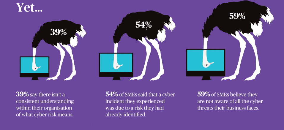 This overconfidence is more evident when 83% said they are sufficiently prepared to overcome a surprise attack by sophisticated hackers or cyber criminals. However, 39% of them reported there isn’t a consistent understanding within their organization of what ‘cyber risk’ means; and 59% believe they are not aware of all the cyber threats their businesses face.