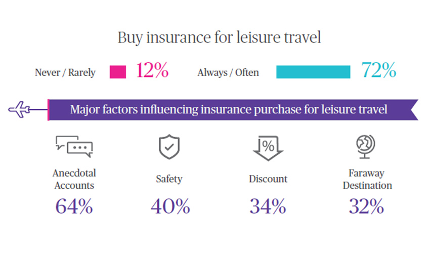 1. Travelling to destinations considered unsafe is an increasingly significant factor influencing the purchase of travel insurance for 40% of respondents, an increase of 11% in contrast to survey results two years ago. Anecdotal accounts of traveling without insurance is the most influential factor in purchasing travel insurance (64%).