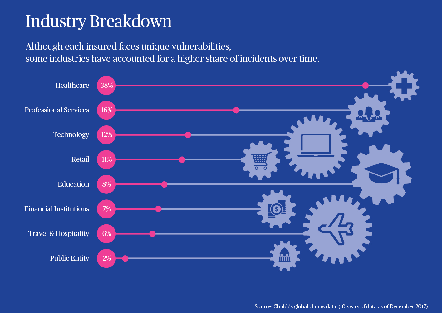 Based on an analysis of Chubb’s prior decade of claims experience, the healthcare industry made up 38% of all claims reported during that period. Further, the trend of incidents impacting the industry has continued into 2018 as the number of Chubb healthcare cyber-related incidents grew 13% over the past two years.