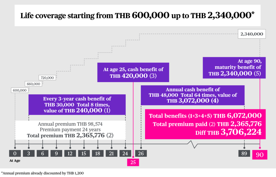 *In case of death before age 90, the company will pay the amount of sum assured at that moment, starting from THB 600,000 up to THB 2,340,000 or cash surrender or paid premium deducted by all cash coupons which have already received from policy benefit, depending whichever is the highest.