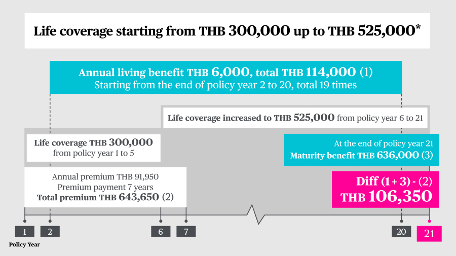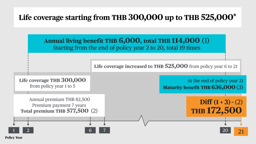 *In case of death before the end of contract, the company will pay the amount of sum assured at that moment starting from THB 300,000 up to THB 525,000 or cash surrender value or paid premium deducted by all cash coupons which have already received from policy benefit, depending whichever is the highest.