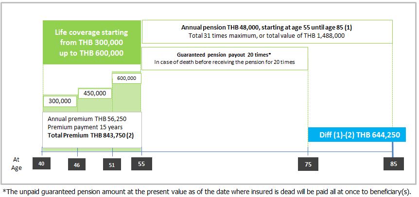 In case of death before age 55, the company will pay the life coverage benefit at that particular moment, starting from THB 300,000 up to THB 600,000.