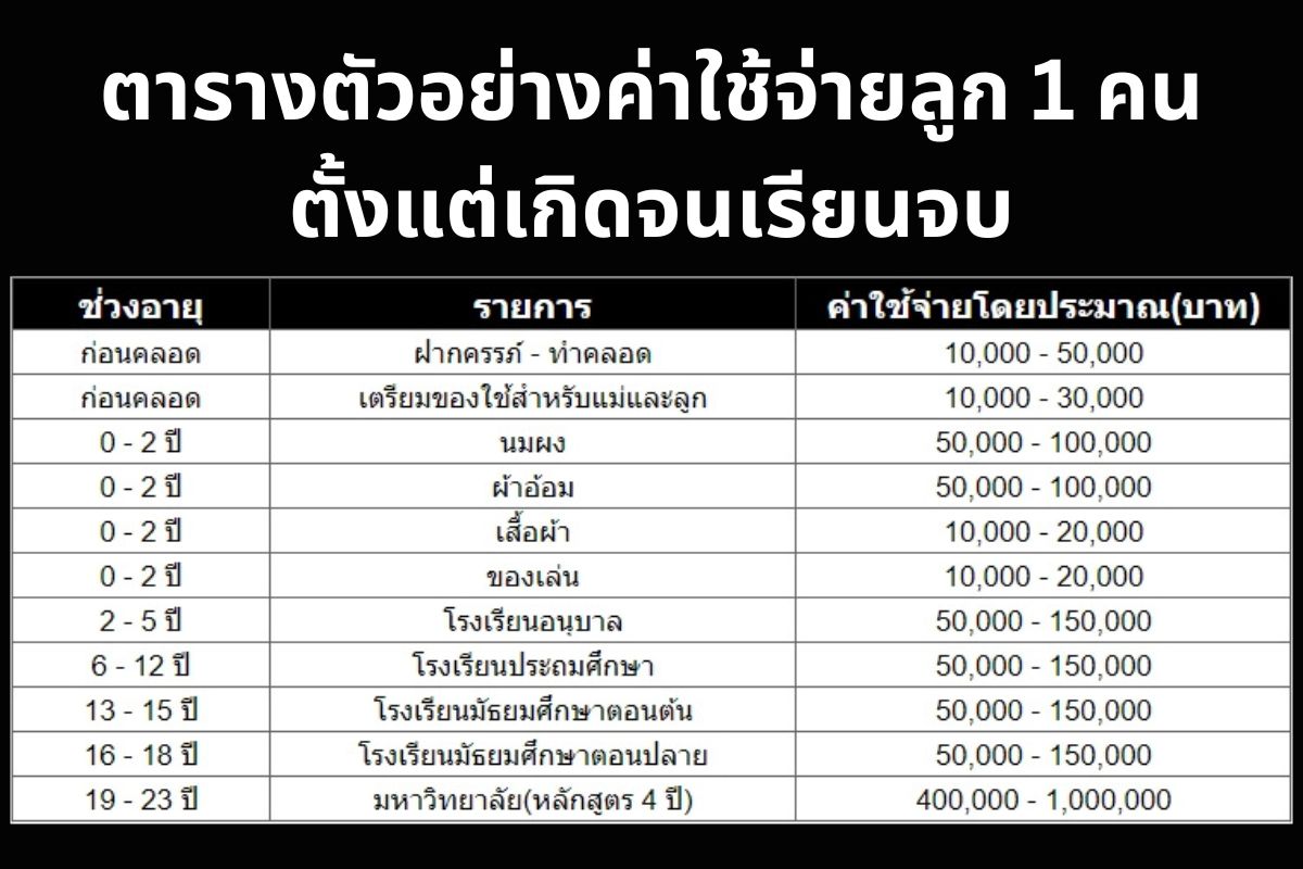 จะเห็นได้ว่าค่าใช้จ่ายต่อลูก 1 คน ในช่วงเวลา 20 ปี ไม่ใช่น้อยๆ เลยทีเดียว ยังไม่รวมค่าใช้จ่ายฉุกเฉินที่ไม่สามารถคาดเดาได้ หรือค่าสิ่งของจิปาถะอื่นๆ ที่ลูกเรียกร้องแล้วคุณพ่อคุณแม่ก็ปฎิเสธไม่ลง บางครอบครัวที่มีลูกมากกว่า 1 คน รวมรายจ่ายทั้งหมดก็หลายล้านบาท