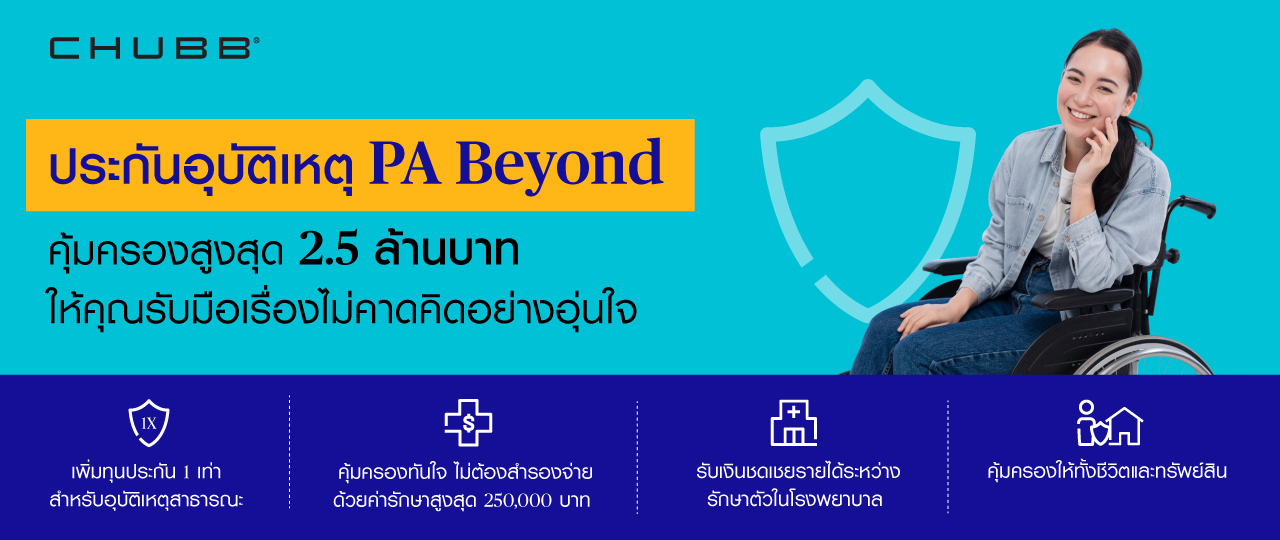 ไม่ว่าคุณจะเผชิญเหตุการณ์ไม่คาดฝันจากกิจกรรมทางน้ำ หรืออุบัติเหตุในชีวิตประจำวัน แผนประกันอุบัติเหตุ PA Beyond พร้อมเคียงข้างด้วยความคุ้มครองที่ครอบคลุม ทั้งค่ารักษาพยาบาลจากอุบัติเหตุ ค่าชดเชยกรณีทุพพลภาพ หรือเสียชีวิตจากเหตุการณ์ไม่คาดคิด ให้คุณอุ่นใจมากขึ้นทุกครั้งที่ใช้ชีวิตหรือทำกิจกรรมกลางแจ้ง ไม่ว่าจะบนบกหรือน้ำ เพราะความพร้อมรับมือคือการป้องกันที่ดีที่สุด