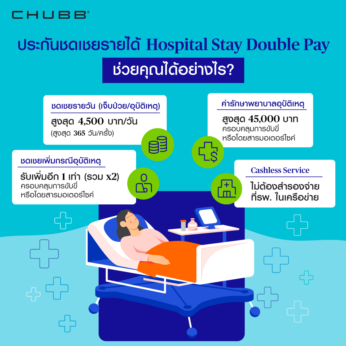 สนใจรายละเอียด Hospital Stay Double Pay จากชับบ์สามัคคีประกันภัย โทร. 02 180 5063 (จันทร์-ศุกร์ 9.00-18.00 น.)