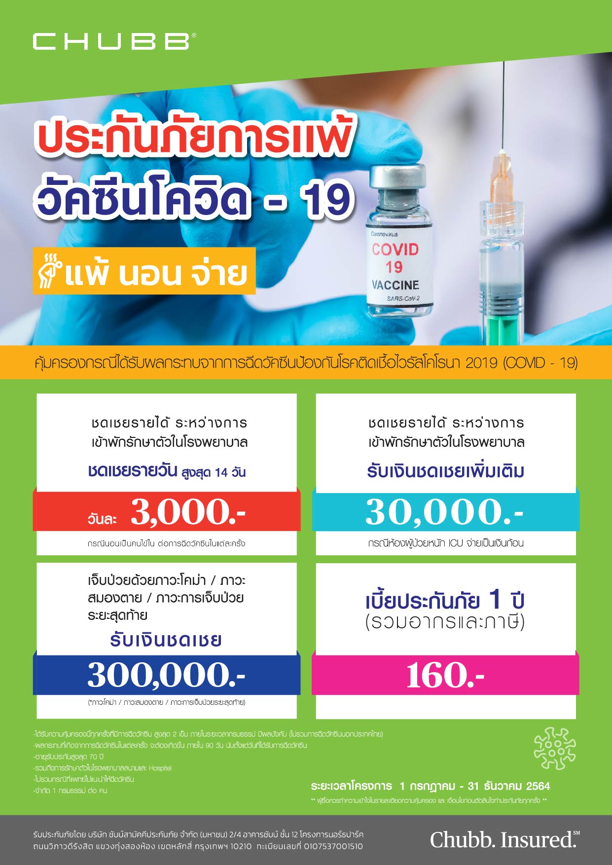 2. ได้รับความคุ้มครองนี้ทุกครั้งที่มีการฉีดวัคซีน สูงสุด 2 เข็ม ภายในระยะเวลากรมธรรม์มีผลบังคับ (ไม่รวมการฉีดวัคซีนนอกประเทศไทย)