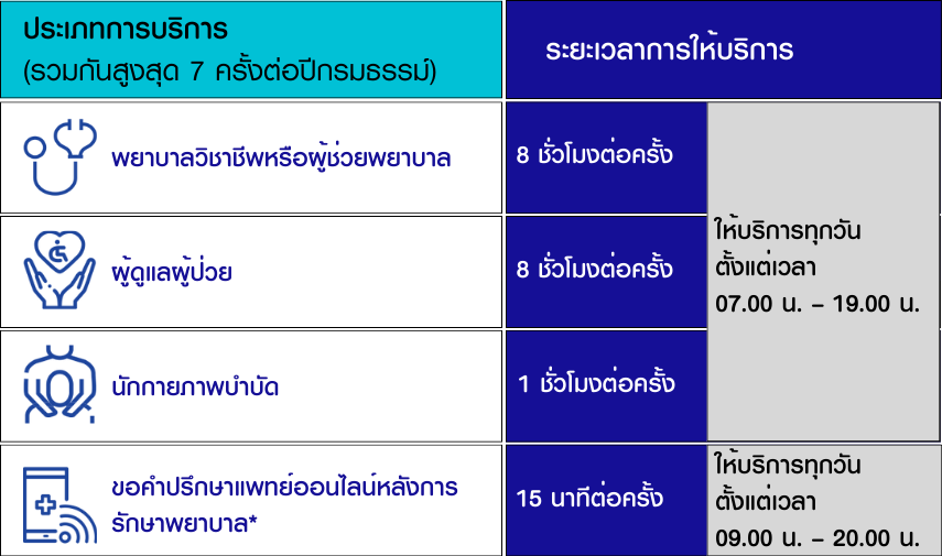 *สำหรับผู้ถือกรมธรรม์ที่มีสัญญาเพิ่มเติม เฮลท์ พรีเมียม (HP), เฮลท์ พรีเมียม พลัส (HPP), เฮลท์ โพรเทคเตอร์ (HSP), เอช เอส พี พี (HSPP) แผน 3-5 และ เฮลท์ พรีเมียม เอ็กซ์ตร้า (HPE) แผน 3-6 เท่านั้น ทั้งนี้ สามารถมอบสิทธิพิเศษให้สมาชิกในครอบครัว รวมถึงบริการดูแลต่อเนื่องที่บ้านด้วย