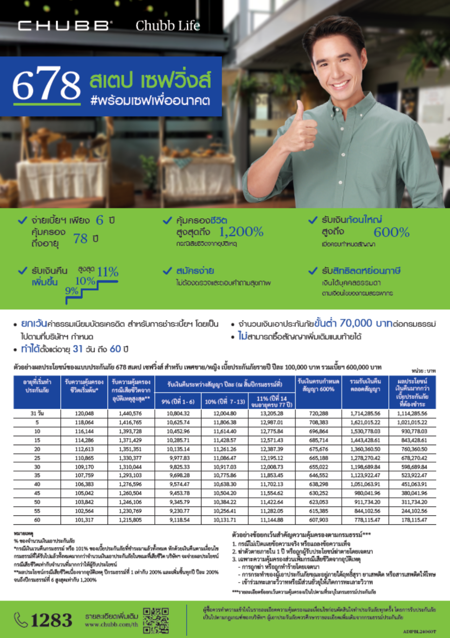 หากผู้เอาประกันภัยเสียชีวิตเนื่องจากอุบัติเหตุในปีกรมธรรม์ที่ 1-5 บริษัทฯ จะจ่ายเงินจำนวน 200% - 1,000% ของจำนวนเงินเอาประกันภัย โดยเพิ่มขึ้นเป็นลำดับปีละ 200% เช่น หากเสียชีวิตเนื่องจากอุบัติเหตุในปีกรมธรรม์ที่ 3 บริษัทฯ จะจ่ายเงินจำนวน 600% ของจำนวนเงินเอาประกันภัย เป็นต้น และหากผู้เอาประกันภัยเสียชีวิตเนื่องจากอุบัติเหตุในปีกรมธรรม์ที่ 6 จนถึงปีที่อายุครบ 78 ปี บริษัทฯ จะจ่ายเงินจำนวน 1,200% ของจำนวนเงินเอาประกันภัย