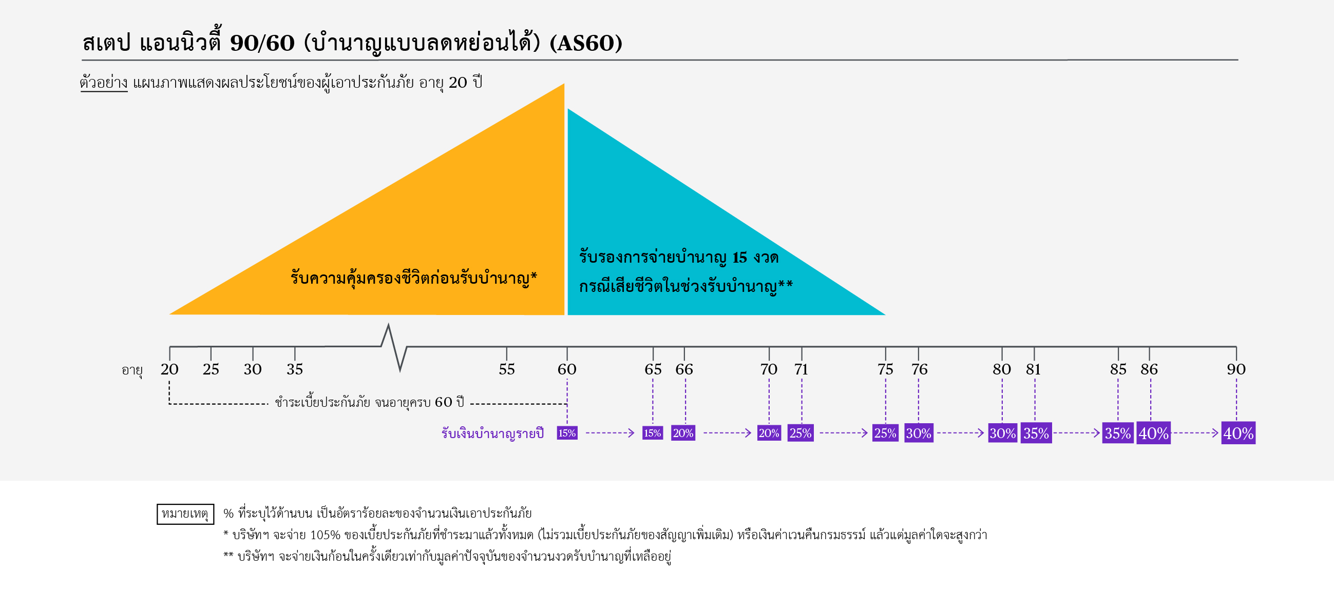 หากผู้เอาประกันภัยมีชีวิตอยู่ บริษัทฯ จะจ่ายเงินบำนาญให้แก่ผู้เอาประกันภัยเท่ากับร้อยละของจำนวนเงินเอาประกันภัยตามตารางด้านล่างทุกวันครบรอบปีกรมธรรม์ ตั้งแต่วันครบรอบปีกรมธรรม์ที่ผู้เอาประกันภัยมีอายุครบ 60 ปี จนถึงวันครบรอบปีกรมธรรม์ที่ผู้เอาประกันภัยมีอายุครบ 90 ปี