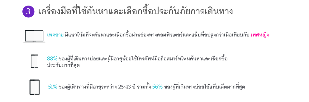 3.มีการใช้เครื่องคอมพิวเตอร์/ แล็ปท็อป และโทรศัพท์มือถือสมาร์ทโฟนในการใช้ค้นหาและเลือกซื้อประกันภัยการเดินทางในระดับใกล้เคียงกัน ผู้ที่เดินทางบ่อยและผู้ที่มีอายุน้อยเป็นกลุ่มที่ใช้โทรศัพท์มือถือสมาร์ทโฟนในการค้นหาและเลือกซื้อประกันภัยการเดินทางมากที่สุด
