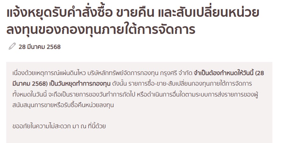 - 28 มี.ค. - บลจ กรุงศรี แจ้งหยุดรับคำสั่งซื้อขายกองทุน