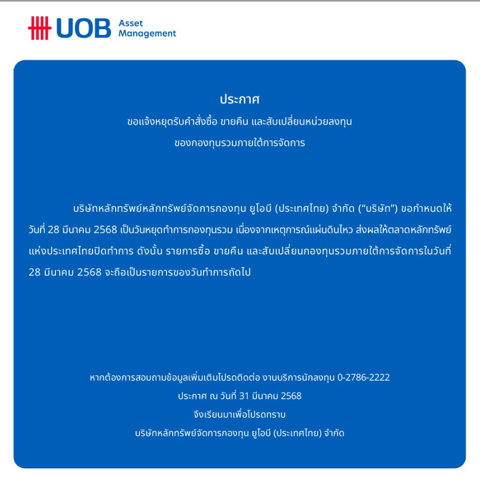 - 28 มี.ค. - บลจ ยูโอบี แจ้งหยุดรับคำสั่งซื้อขายกองทุน